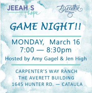 This month’s Breathe will be hosted by Amy Gagel & Jen High. We’ll gather at Carpenter’s Way Ranch (Hope Foster Care’s location) to intentionally connect, share & encourage one another in our fostering and adoptive journeys. Get ready to relax and laugh as we PLAY SOME GAMES!!