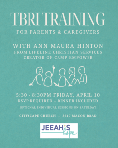 We’re excited to offer a night of TBRI training for parents and caregivers with the one and only Ann Maura Hinton. Ann Maura is the creator of our beloved Camp Empower and is a gifted speaker, teacher and communicator. We’re going to pack as much training into the 3 hours as we possibly can – we’ll get started right at 5:30 (feel free to come a few minutes early)! Foster Care training hour certificates are available upon request.