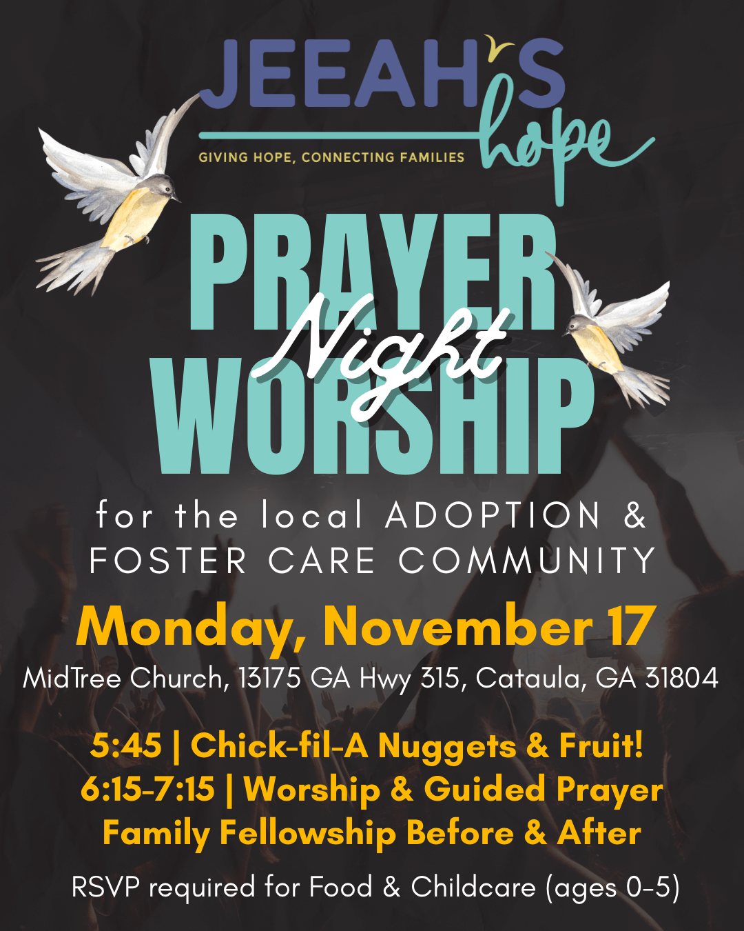 You are invited to our annual Night of Prayer and Worship for the local Adoption & Foster Care Community! Monday, November 17 at MidTree Church, 13175 Hwy 315, Cataula, GA […]